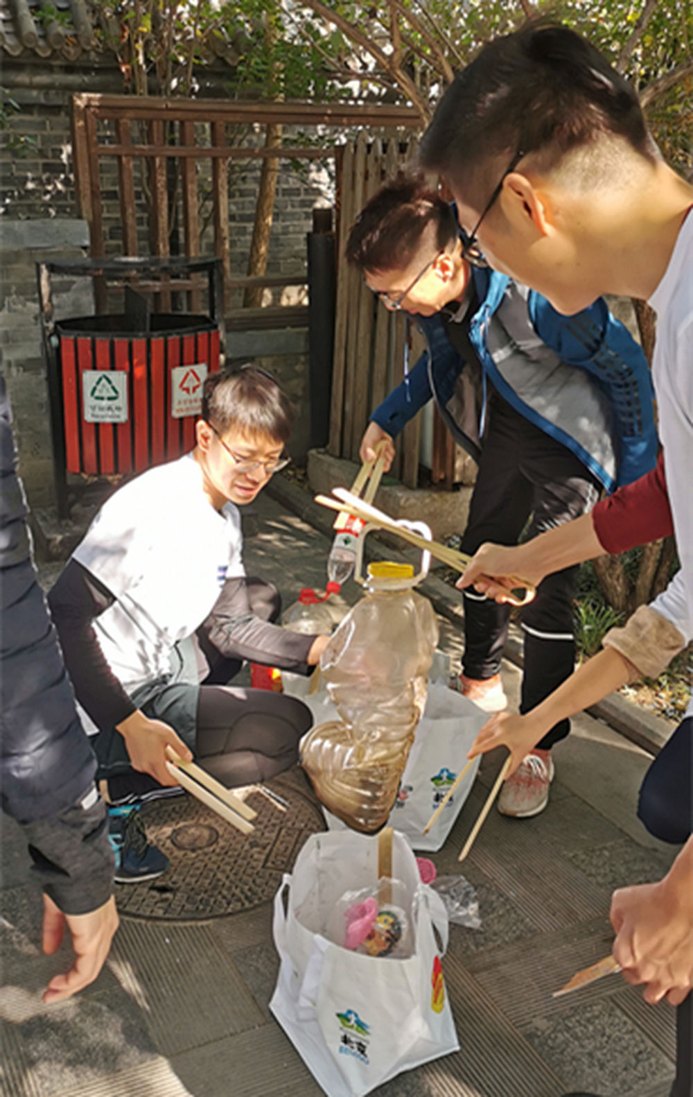 24歲的德國(guó)留學(xué)生卜加德是小組里撿到垃圾最多的人。抵達(dá)終點(diǎn)后,他和隊(duì)友擊掌合影,隨后便將幾大袋垃圾仔細(xì)分類——不可回收的煙頭等扔到垃圾箱,可回收的瓶子、紙盒裝在袋子里,等保潔車來(lái)裝運(yùn)。